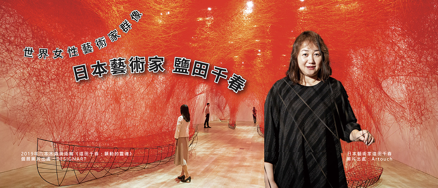 塩田千春(Chiharu Shiota)1972年出生於大阪,1996年日本京都精華大學(きょうとせいかだいがく)畢業後,赴德於柏林藝術大學及漢堡造型藝術學院深造,現定居於柏林。2008年陸續在世界各地舉辦個展,2015年成為第56屆「威尼斯雙年展」的日本館代表藝術家,2019年於六本木森美術館舉辦《塩田千春:顫動的靈魂》個展,吸引了近70萬的觀眾,創下該館人數歷年第二高的人氣紀錄。