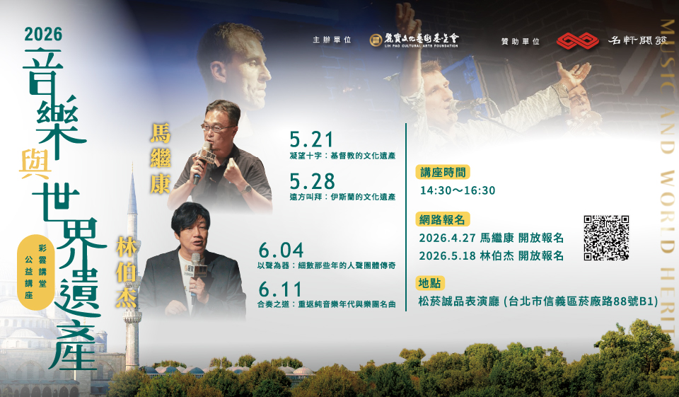 今年彩雲講堂「音樂與世界文化遺產」講座,基金會特別邀請世界遺產資深領隊馬繼康老師,帶領大家走入人類文明的重要現場,從基督教的教堂藝術,到伊斯蘭教所呈現的清真寺與精神信仰,看宗教如何形塑文化樣貌,並在歲月中留下不朽的印記。前金革唱片林伯杰音樂總監,則和大家共同回溯人聲團體與純音樂樂團的發展軌跡,走進唱片工業的黃金年代,細數偶像歌手如何成為時代記憶,並透過一首首經典名曲,喚起深藏於生命中的情感共鳴。彩雲講堂誠摯的邀請您,透過熟悉的旋律回首生命動人時刻,與我們一起傾聽世界的聲音,感受人類文明綿延不息的精神與感動。