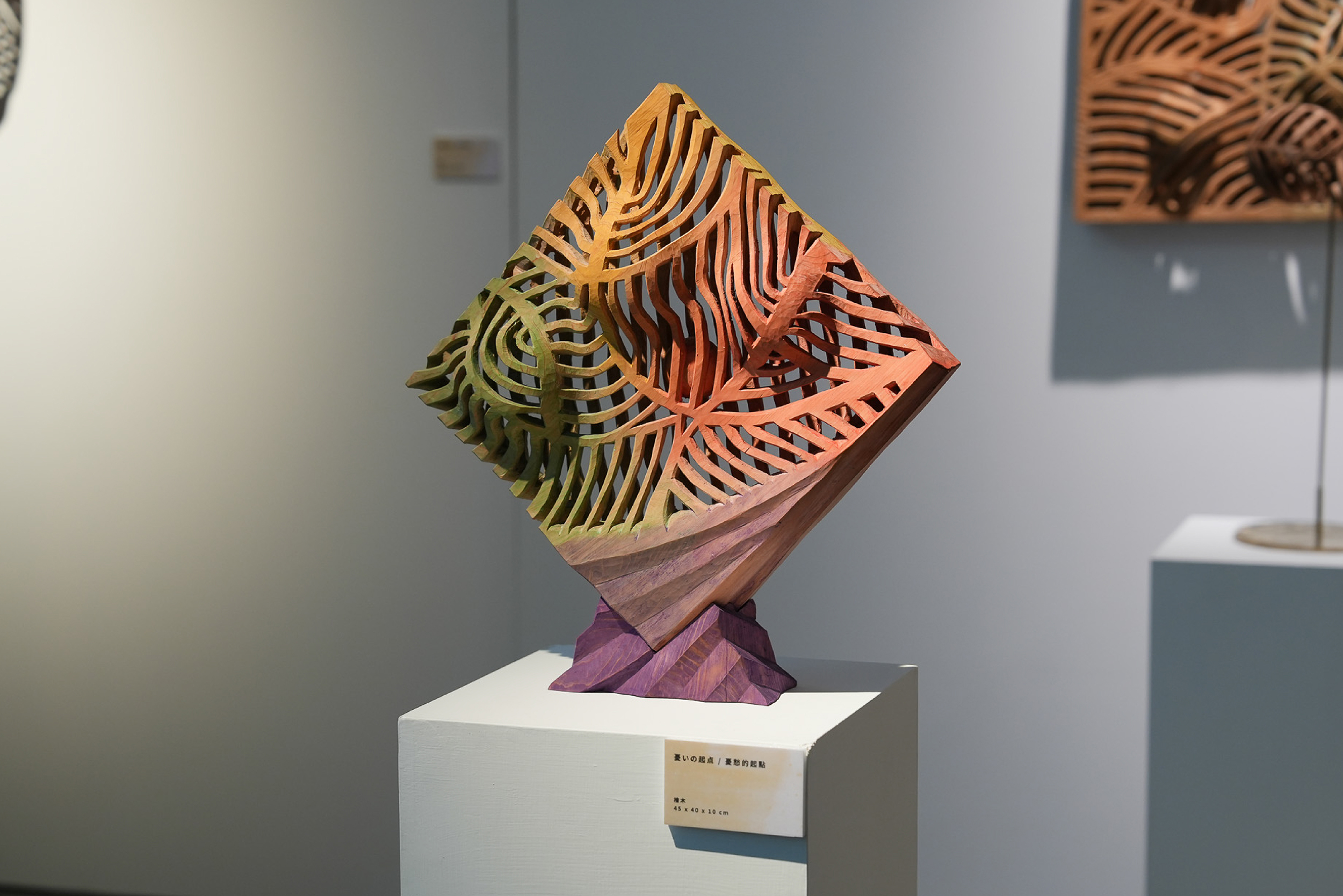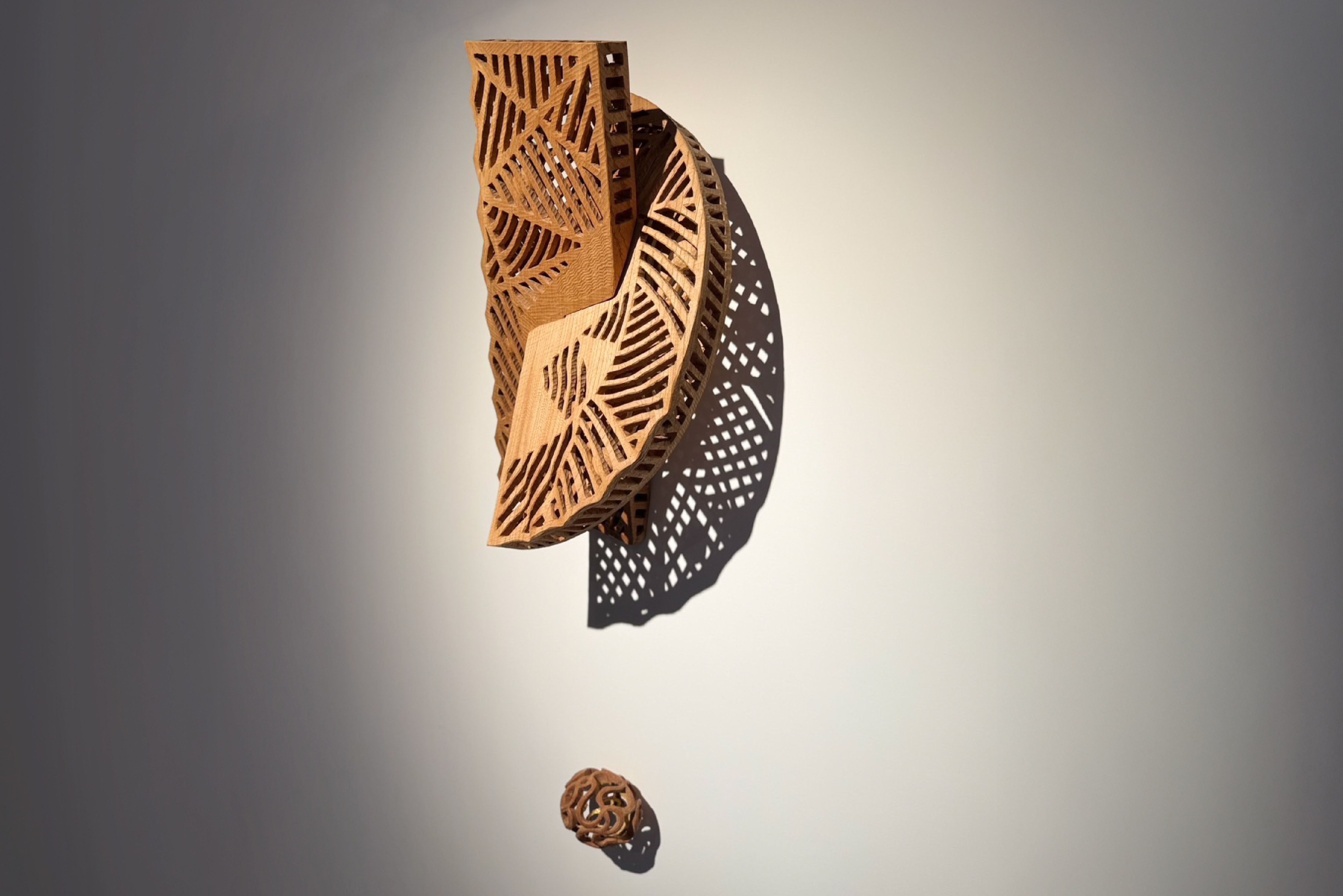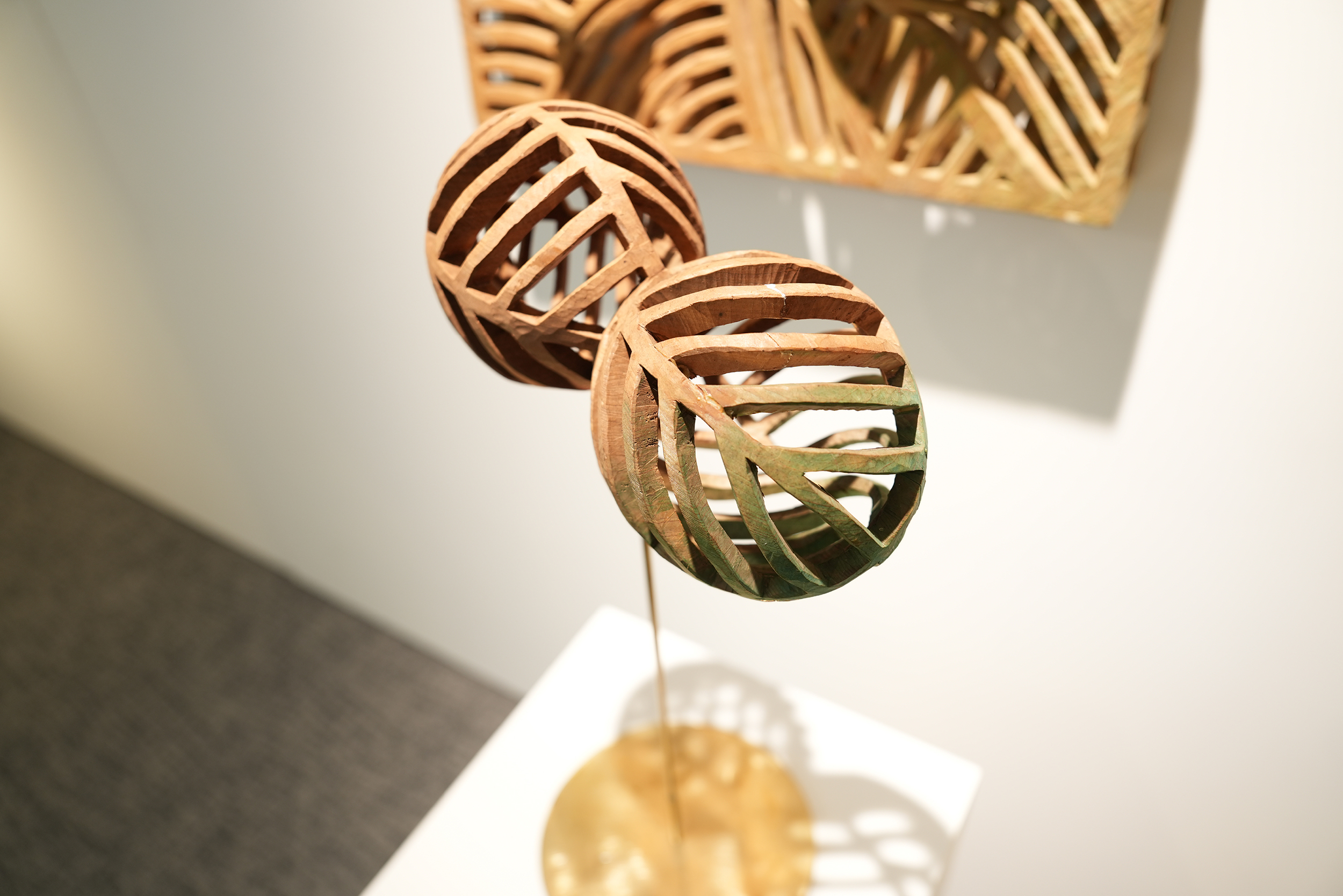 這次另一類作品是將木材鏤空,利用打光使之產生美麗的影子,如同葉隙流光般饒有文學的意涵,這是他在創作中試圖調整作品與空間的作為,而轉動光影作品可以感受到藝術家將時間性帶入作品的企圖,也是這次個展主題命名為「手與影」的原因。